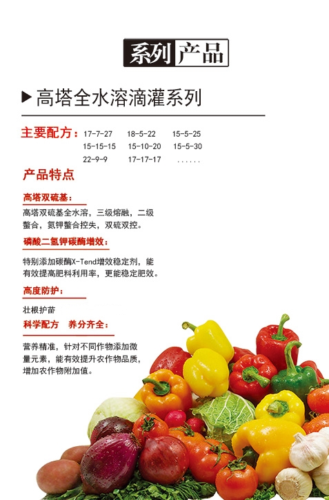 2、高塔全水溶复合肥是一种速效性肥料,水溶性好、无残渣,可以完全溶解于水中,能被作物的根系和叶面直接吸收利用。采用水肥同施,以水带肥,实现了水肥一体化,它的有效吸收率高出普通化肥一倍多;而且肥效快,可解决高产作物快速生长期的营养需求。配合滴灌系统需水量仅为普通化肥的30%,而施肥作业几乎可以不用人工,大大节约了人力成本。