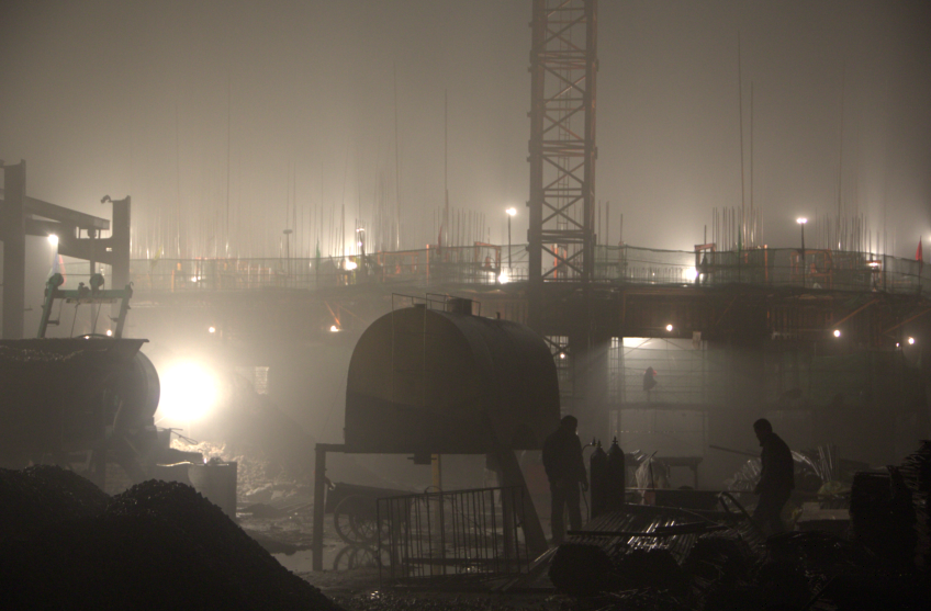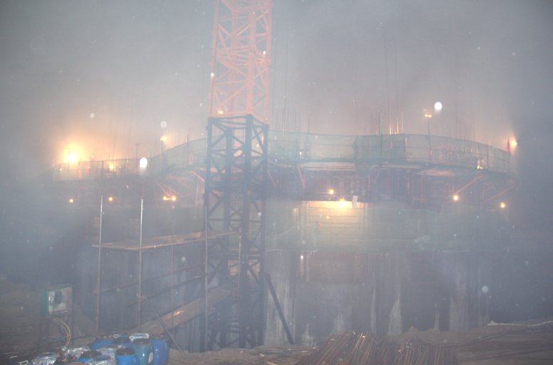 山东天山丰耘生态肥业有限公司年产20万吨高塔硝硫基缓释复合肥项目建设工地,灯火通明,热火朝天,施工人员加班加点、冒雨施工。