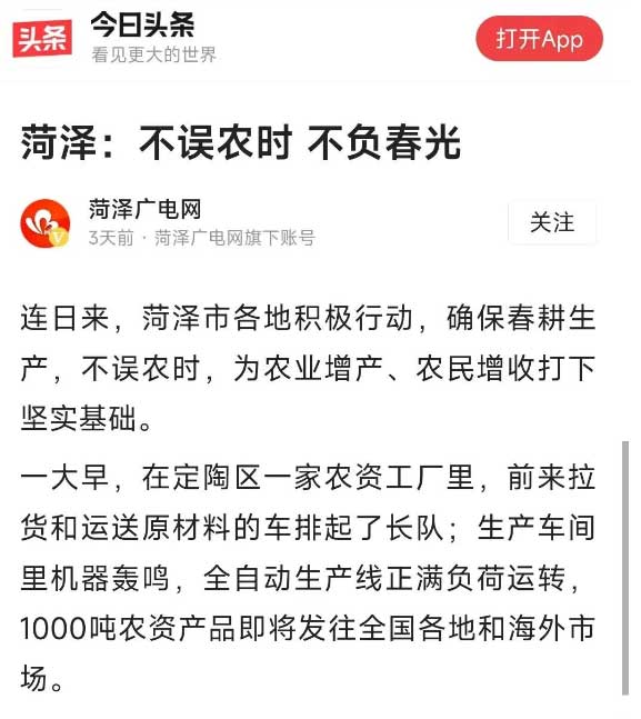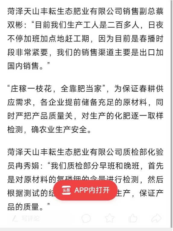 近日,天山丰耘肥业在农业生产领域的积极行动成为了今日头条的热点新闻。在这个关键的农时季节,天山丰耘肥业以其出色的表现,为农业生产注入了新的活力。